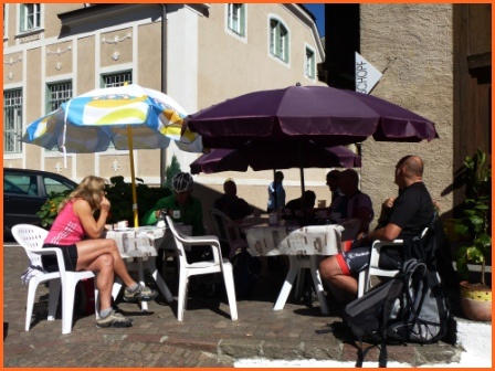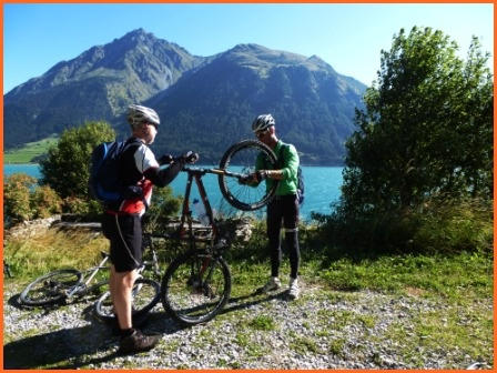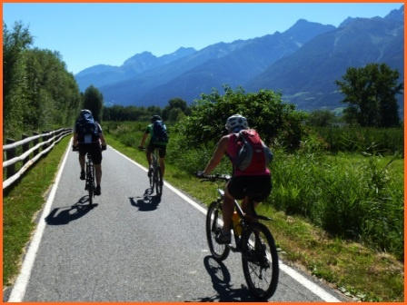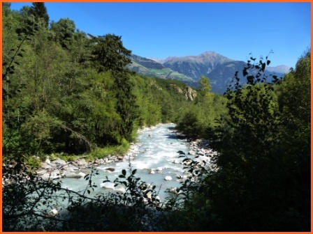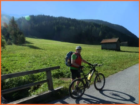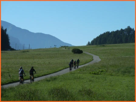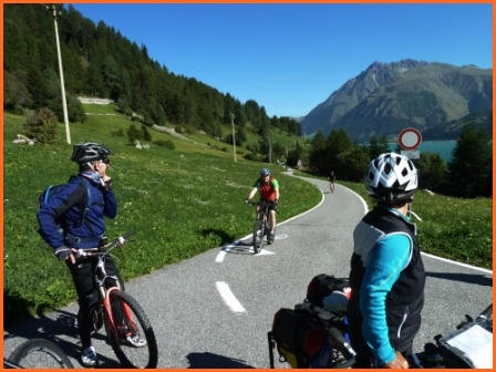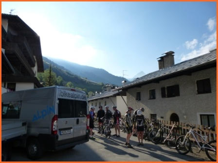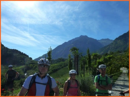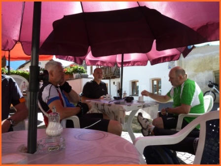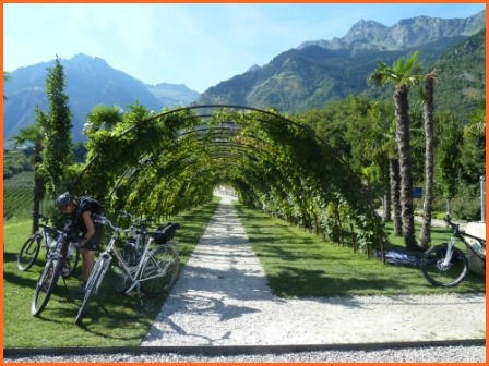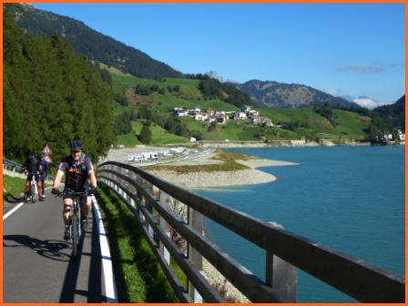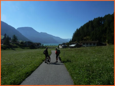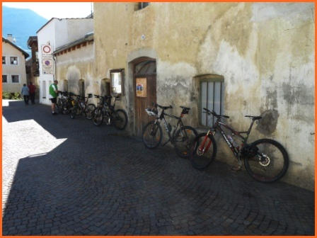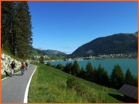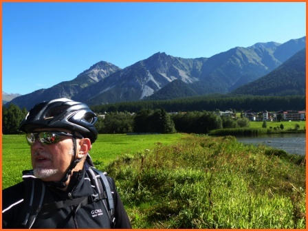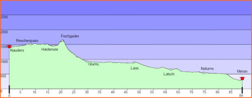 Kurze Tourbeschreibung:Nauders-Meran (89 Km, 796 Hm):Von Nauders geht es über den Reschenpass nach Südtirol. Entlang des Reschen- und Haidersees mit besten Ausblicken auf den 3905 Meter hohen Ortler, den höchsten Berg Südtirols und der Königsspitze, folgen wir der Via Claudia nach Glurns zur obligatorischen Kaffeepause am Stadtplatz. Dann immer leicht abwärts bis Laas, wechselnd auf Schotter, Feld- und Fahrradwegen bis Naturns und weiter nach Meran. Am Hotel“Magarethe-Maultasch” starten wir heute zu einer “Erholungstour” vor uns. Die Temp. nimmt jetzt jeden Tag zu je weiter wir nach Süden fahren.Ein kleiner Buckel namens “Rechenpass” liegt gleich vor uns und dann geht es nur noch abwärts am Rechensee und den vielen kleinen Ortsschaften im Vinschgau vorbei, wo ich 2012 mit Burkhard in Latsch war - vertraute Umgebung.