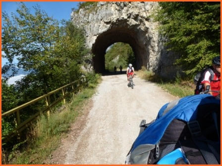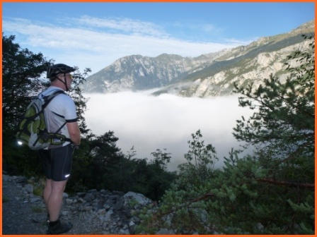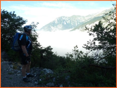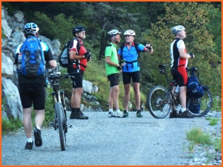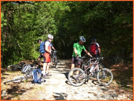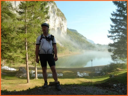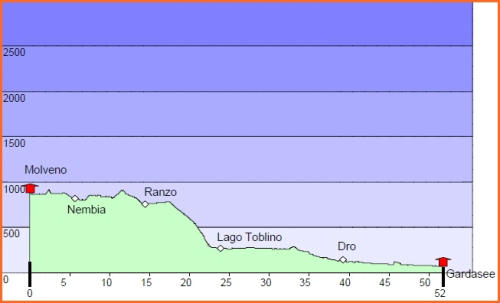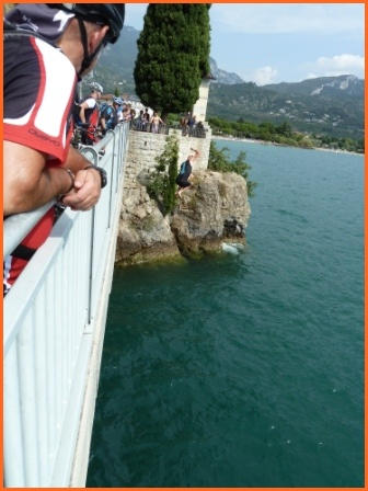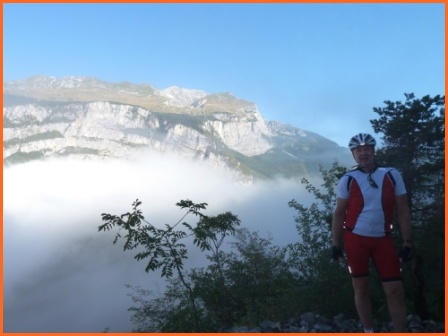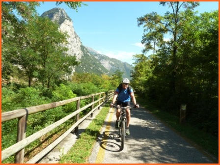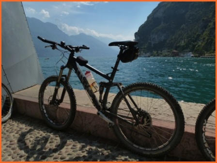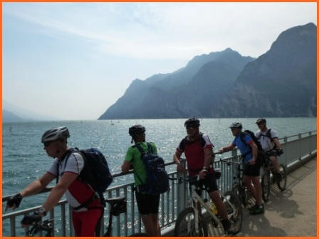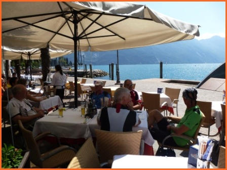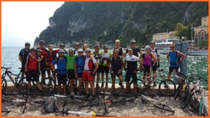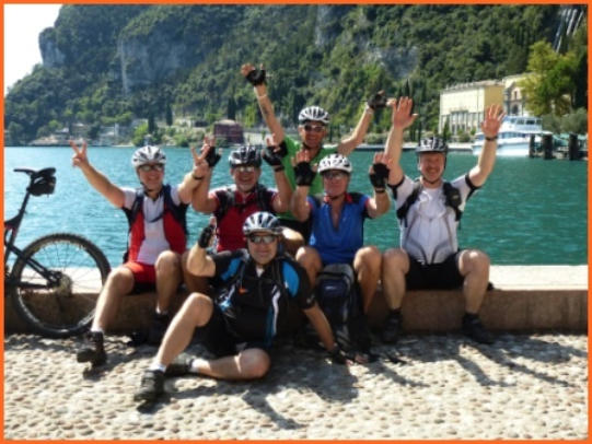 Kurze Tourbeschreibung:Molveno-Riva (52 Km, 460 Hm):Heute ist die Finale Etappe an den Gardasee. Entlang des Lago Molveno fahren wir nach Nembia. Auf schöner Piste geht es eindrucksvoll hinunter an den Lago di Toblino. Auf einem Trail fahren wir westlich des Lago Cavedine nach Dro. Unterhalb der Felswände geht es nach Arco und an den Gardasee. Es ist vollbracht, wir sind am Ziel! Jetzt können wir die wohlverdiente Pizza und Eisbecher genießen und warten auf die zweite Gruppe. Nach dem die Zweite Gruppe eingetroffen ist, machen wir noch unser Gruppenfoto. Wir räumen dann den Tisch für die Jungs und Mädels und fahren gemütlich den Uferradweg nach Riva entlang. Auf dem Weg nach Torbole, wo wir im Hotel “La Vela”nächtigen werden, machen wir noch zwei stopps um uns im See abzukühlen.