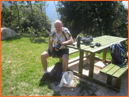Kurzer Tourbericht:Zum Startpunkt der Tour mussten wir zu erst nach Riva kurbeln. In Riva angekommen, ging es gleich mit einen ordendlichen Steigung in die Tour. Es ging bis hoch nur auf Asphalt und fast non stop in der glühenden August-Sonne nach oben. Unterwegs waren wir um jeden Meter Schatten froh. Es gab kaum Aussichtspunkte! Oben angekommen, haben wir uns erst mal ein kühles aklfreies Weizen reingeschüttet. Ansch. haben wir die Spaghetti aglio olo zum auffüllen unseres Speichers bestellt. Ich muss sagen - super!Danach sind wir den Trail mit Ausgang Limo gefahren. Ein Teilstück war der bekannte Karrenweg. Er besteht aus gr. Steinplatten in Treppenform.