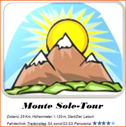 Kurzer Tourbericht:Die Tour (T 10) ist in Latsch gestartet. Von da aus sind wir die Via Claudia Augusta bis Kastellbell gefahren (optimal zum warmfahren). In Kastellbel ist es dann stetig Bergauf gegangen. Man hatte immer wieder sehr schöne Aussuchtspunkte ins Tal.Zwischen durch gabe es immer wieder kurze und steile Anstiege - die schwer oder garnicht fahrbar waren. Die Trailabfahren waren gut zu fahren und wir hatten riesen Spaß gemacht. Monte Sole heisst übersetzt: Sonnenberg.